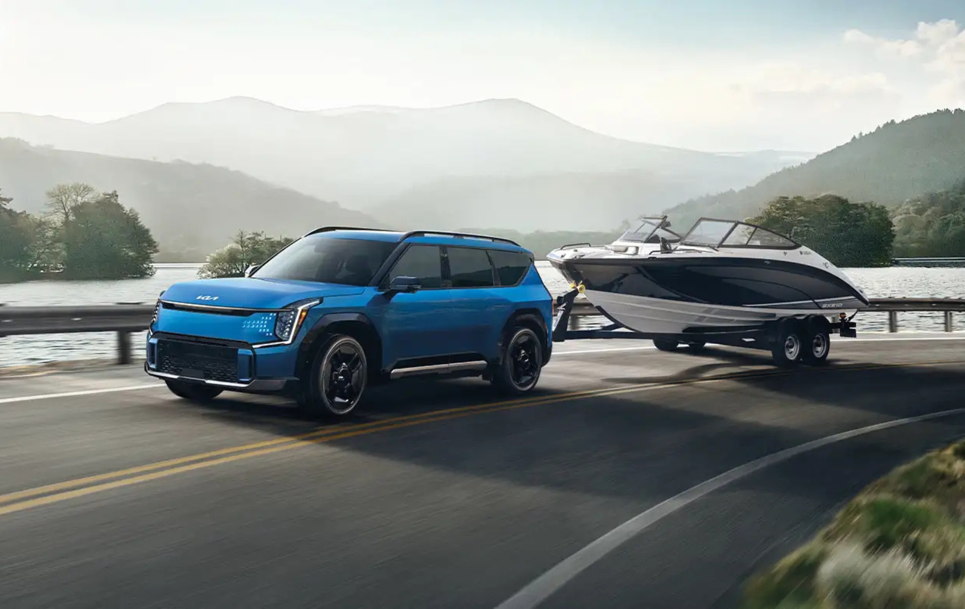 The EV9 doesn’t just run on electricity, it runs on excitement. It can tow up to 5,000 lbs (2,267 kg) when properly equipped, so bringing along the boat or trailer for a family getaway is no problem. And with available multi-terrain all-wheel drive, this SUV is ready to leave the pavement behind for those off-road escapes.
